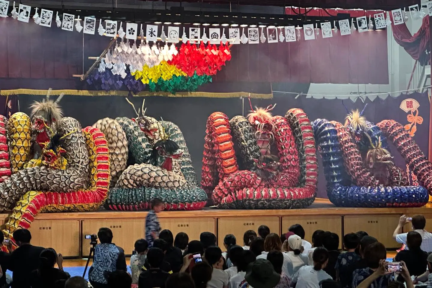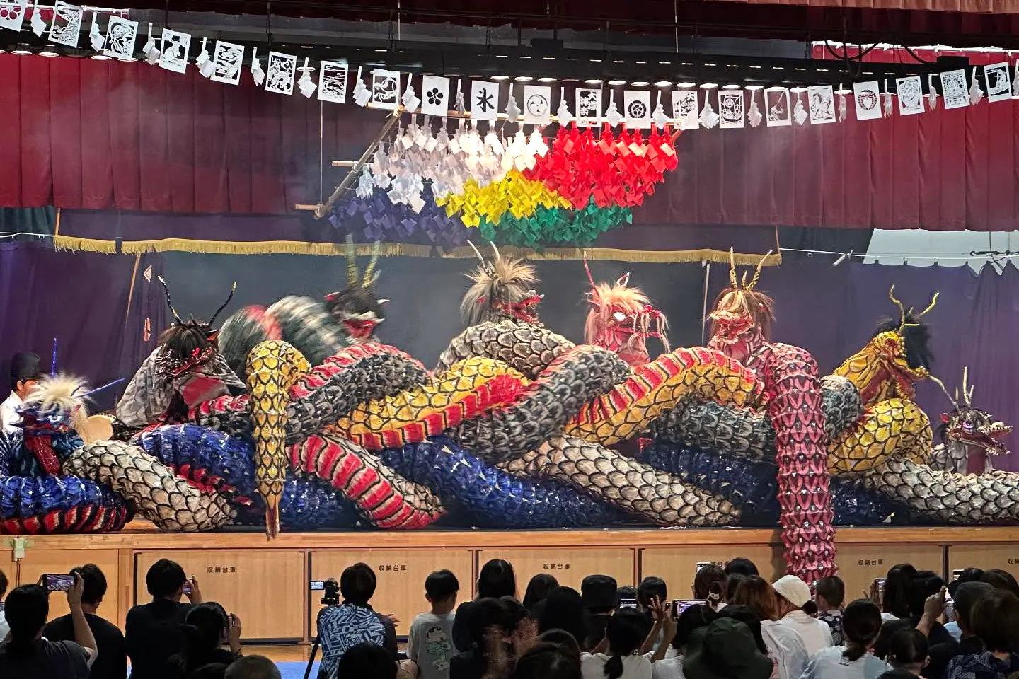 一つの胴体に八つの頭と尾を持つ巨大な大蛇(ホオズキのように赤い目、ヒノキやスギが生えた体)が、舞台狭しと暴れ回る様子が見る人を惹きつけます。