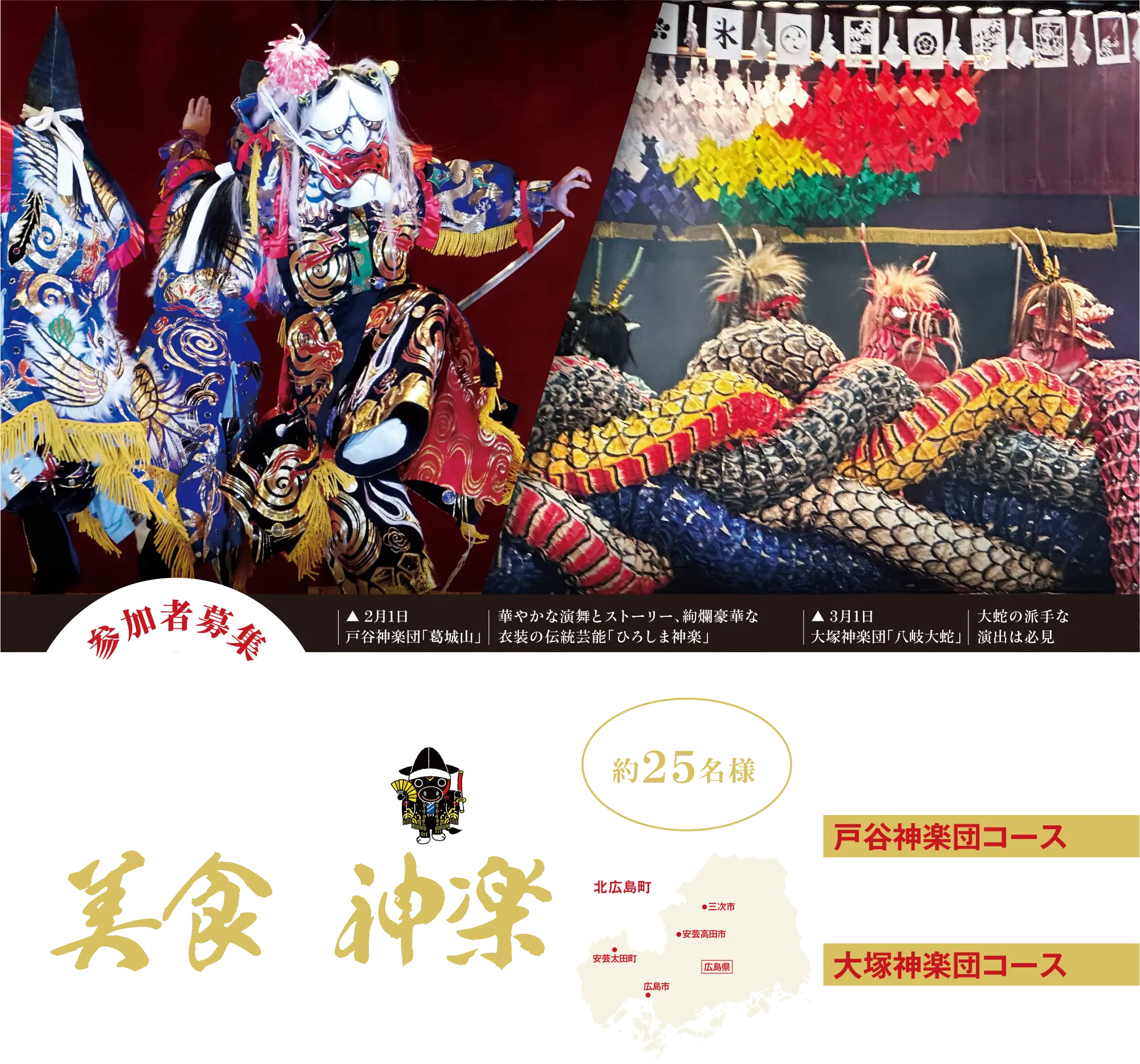 日本一に輝いたお米をはじめ約20種類もの品種を育てている、米どころ広島県北広島町。「稲作文化への感謝と豊穣の祈り」である伝統芸能「神楽」を舞う神楽団も60を超え、「神楽の里」としても全国に知られています。2024年から始まった町のみんなで「きたひろのお米をもっと“おいしく”、“たのしく”」という想いをこめた、おこめの“わわわ”プロジェクトの逸品も話題を呼んでいます。そんな北広島町の“食”と“神楽鑑賞”を体験できるバスツアーです。かまど炊きの北広島米と地元の旬な食材を味わい、華やかな伝統文化をお楽しみください。